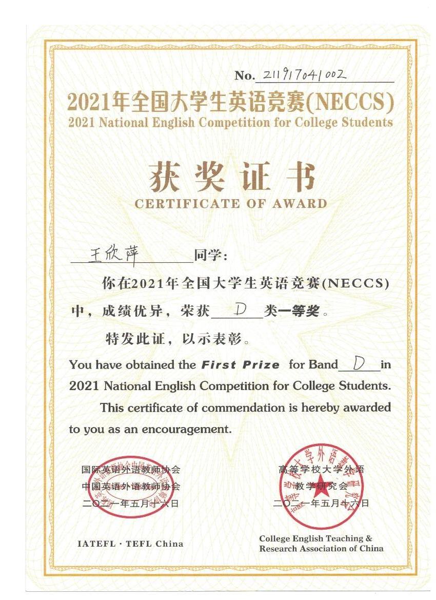 近日全国大学生英语竞赛重庆赛区总决赛在重庆大学圆满落幕。我校2020级两名同学王欣萍和何晟杰获得了全国大学生英语竞赛D类一等奖,学校十余名同学获得了全国大学生英语竞赛D类二等奖,我校荣获2021年全国大学生英语竞赛优秀组织奖。