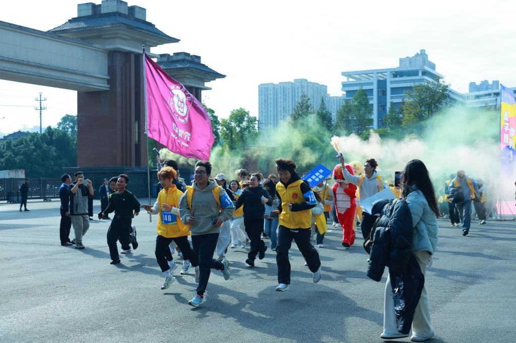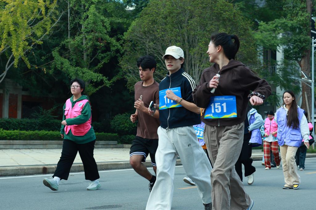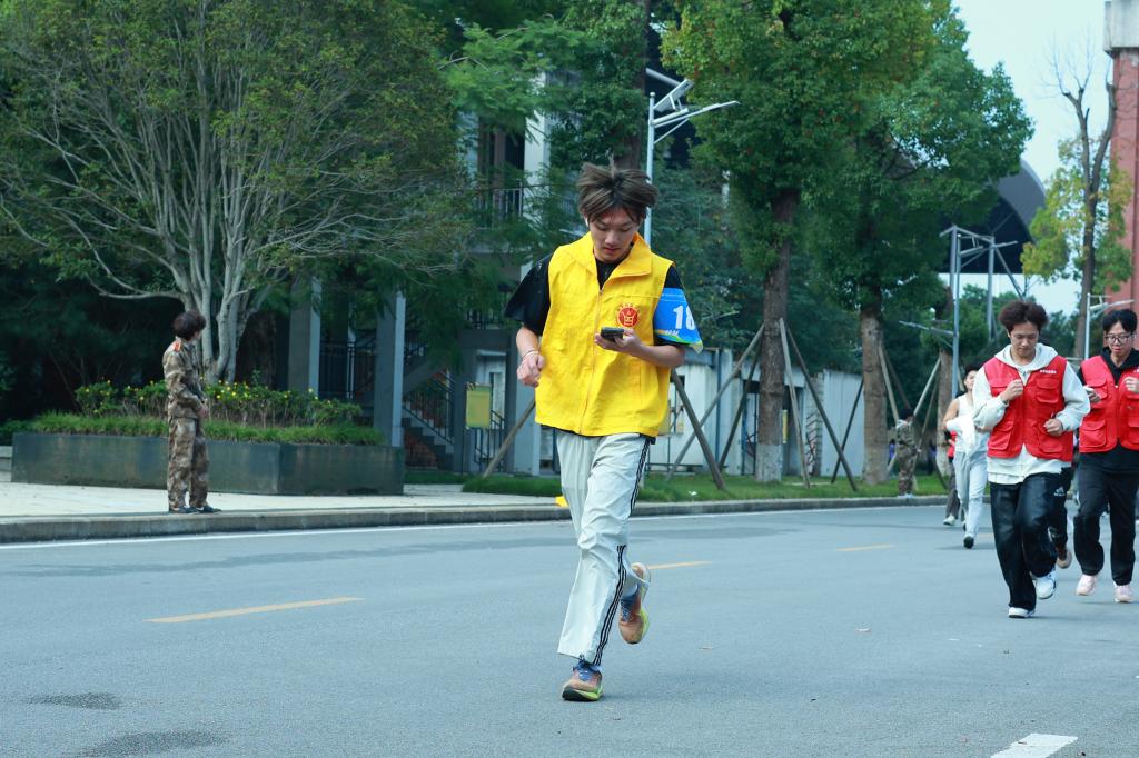比赛当天,由院旗带头,来自全院各年级、各班级的参赛师生身着统一参赛服饰,精神抖擞地集结于起点场。随着发令枪响,选手们迈着矫健的步伐冲出起点,沿着预设赛道奋勇向前。赛道上,既有全力冲刺、追逐佳绩的 “运动达人”,用速度展现青春风采;也有携手同行、稳步前行的师生组合,在奔跑中传递同窗情谊与师生温情;更有不少初次参赛的同学,以坚持代替胜负,用毅力挑战自我极限。志愿者们提前到岗、坚守岗位,在关键路口耐心引导方向、及时提供饮水补给,用热情周到的服务为选手们保驾护航;裁判团队秉持公平公正原则,严谨记录每一位选手的成绩,确保赛事规范有序;医疗人员全程待命,配备急救物资与设备,随时准备应对各类突发情况,为赛事安全筑起 “防护墙”,使整场活动在热烈、有序、安全的氛围中稳步推进。