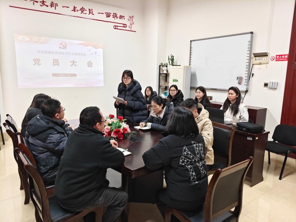 2025年12月5日,智慧商贸学院学生党支部十二月支部委员会会议在笃学楼3412会议室顺利召开。会议由支部书记周庆莲主持,全体支部委员参会。会议严格遵循组织程序,审议并通过了何一鹭同志的转正事宜,并组织开展了专题理论学习,旨在进一步加强支部思想建设,提升委员政治素养和履职能力。