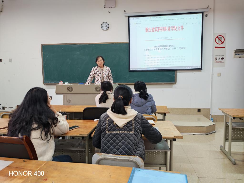 为进一步加强我校“校风、教风、学风”建设,聚焦课堂教学主阵地,近日,重庆建筑科技职业学院下发了《课堂手机管理办法(试行)》的通知,智慧商贸学院的智慧财务教研室组织所属教师和大数据与财务管理专业的学生一起学习了这一文件。通过学习文件凝聚共识、完善保障、协同监督,师生共学共建“无手机课堂”,让课堂回归专注育人本质。