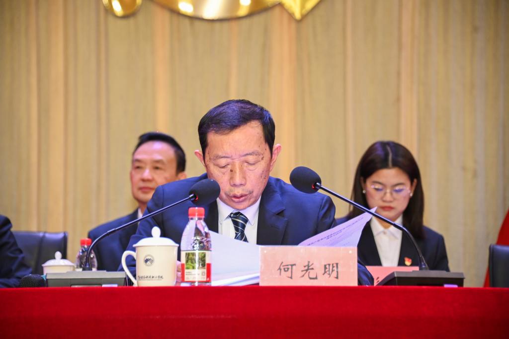 何光明致闭幕词,他表示这次党员大会,全面总结和回顾了学院过去几年来在党的建设和各项事业发展中所取得的成绩、经验,讨论确定了学院今后五年党的建设与改革发展的奋斗目标以及工作任务,选举产生了中国共产党重庆建筑科技职业学院新一届委员会和新一届纪律检查委员会。他希望各党组织、全体党员深入学习贯彻党的二十大和二十届历次全会精神,以习近平新时代中国特色社会主义思想为指导,认真贯彻党的教育方针,以为党育人、为国育才的教育使命,围绕党员大会提出的奋斗目标,扎实工作、开拓创新、砥砺奋进,为把我校建设成为中国一流职业大学而努力奋斗。