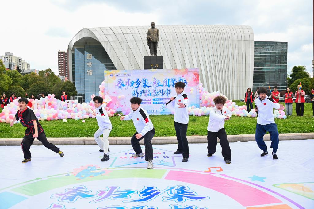 与集市同步上演的,还有恩来广场草坪上的户外音乐节。乐队、合唱队、街舞社、个人歌手轮番登场,民谣、轻摇滚、流行金曲交织响起,共呈现14个节目。“歌词接唱大挑战”“谁是中华小曲库”等互动游戏穿插其中,现场欢呼声此起彼伏。