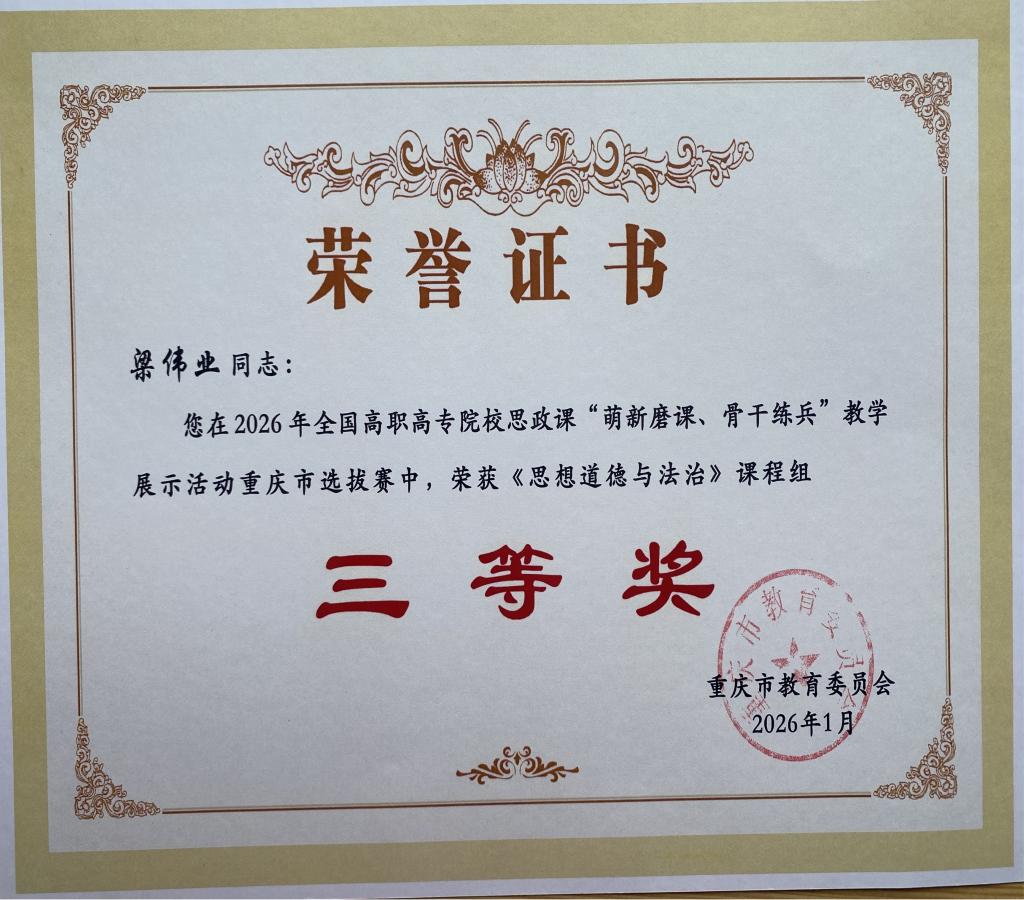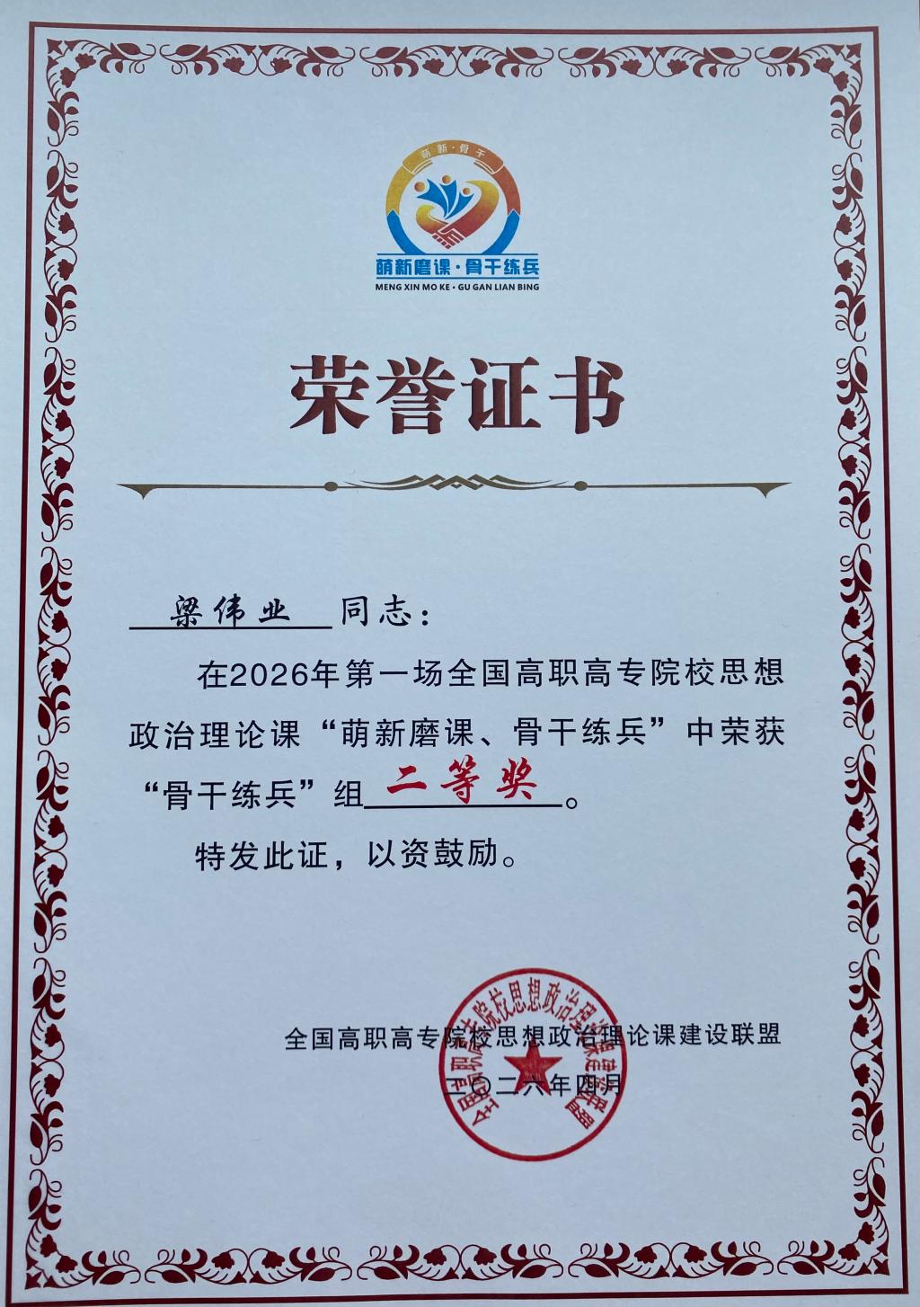 全国高职高专院校思政课建设联盟是在教育部社科司指导下成立的思政课教学协同建设和创新组织。高职高专院校思政课“萌新磨课·骨干练兵”教学展示活动是联盟的品牌活动。我校教师梁伟业在此次活动中表现突出,荣获“骨干练兵”组全国二等奖。