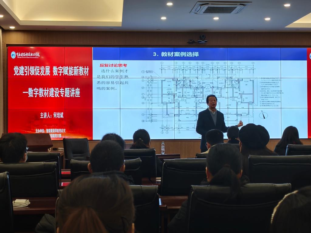 2025年12月12日14:00—16:00,大数据中心内座无虚席,由智能建造学院党总支和通识教育学院党支部共同主办的数字教材建设专题讲座成功举办。重庆建筑科技职业学院副校长何培斌教授受邀作了专题讲座,为全体参会教师带来一场兼具理论高度与实操价值的学术盛宴。