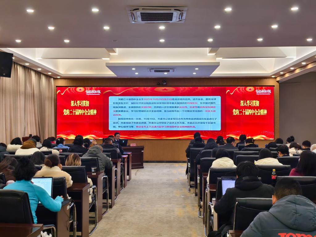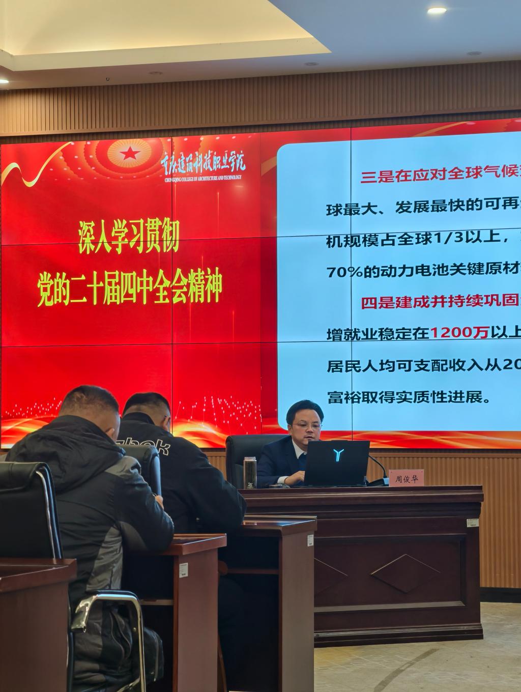 2025年12月24日14点30分,深入学习贯彻党的二十届四中全会精神宣讲会在重庆建筑科技职业学院大数据中心举行,学校副校长兼通识教育学院执行院长周俊华教授受邀作专题授课。通识教育学院和数字艺术学院全体教职工齐聚现场,共同学习领会党的二十届四中全会核心要义与实践要求,凝聚服务区域现代化建设和推动学校高质量发展的奋进力量。