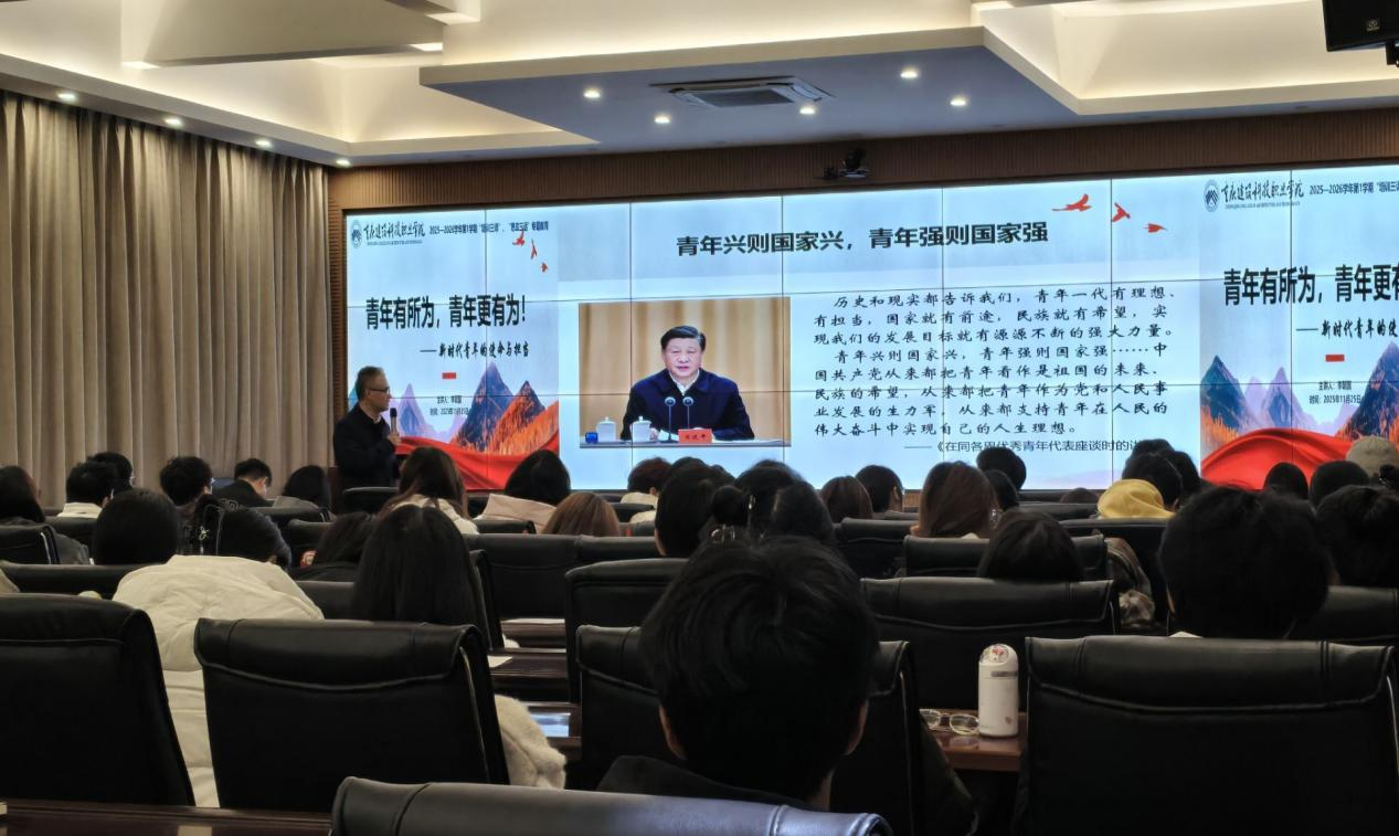 2025年11月25日下午18:00,由学校学工部组织的2025-2026学年第一学期“建青大讲堂”:青年有所为,青年更有为!专题讲座在大数据中心举行。本次讲座由学校副校长李朝国主讲,值班书记、辅导员以及在校学生代表共90人共同参加。