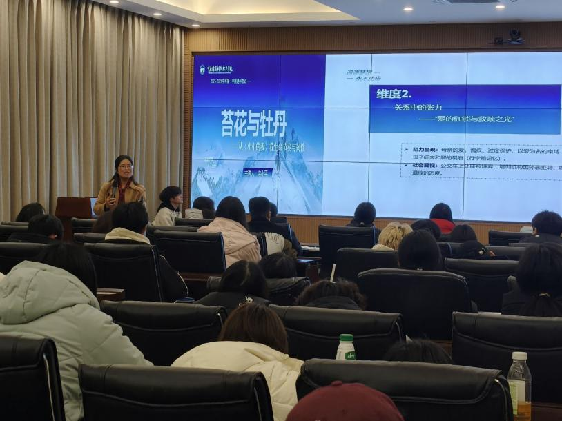2025年12月16日下午18:00,由学校学工部组织2025-2026学年第一学期“建科夜话”之生命的韧性:苔花与牡丹——从《小小的我》看生命节奏与韧性专题讲座在大数据中心举行。本次讲座由学校学工部部长冉小平老师主讲,值班书记、辅导员以及在校学生代表共90人共同参加。