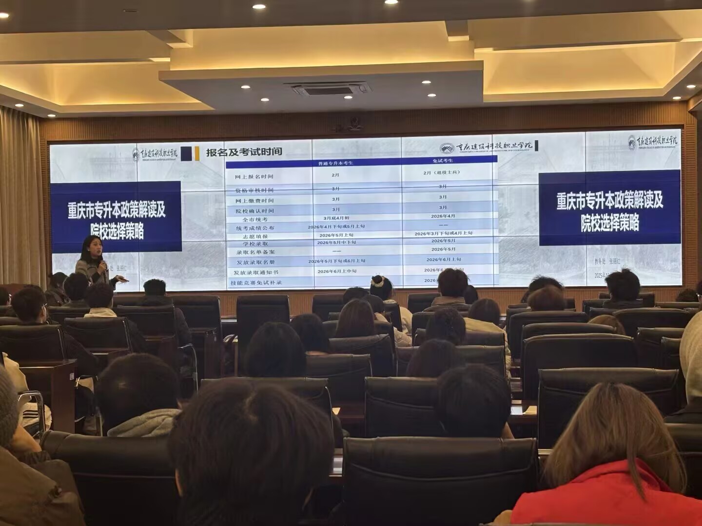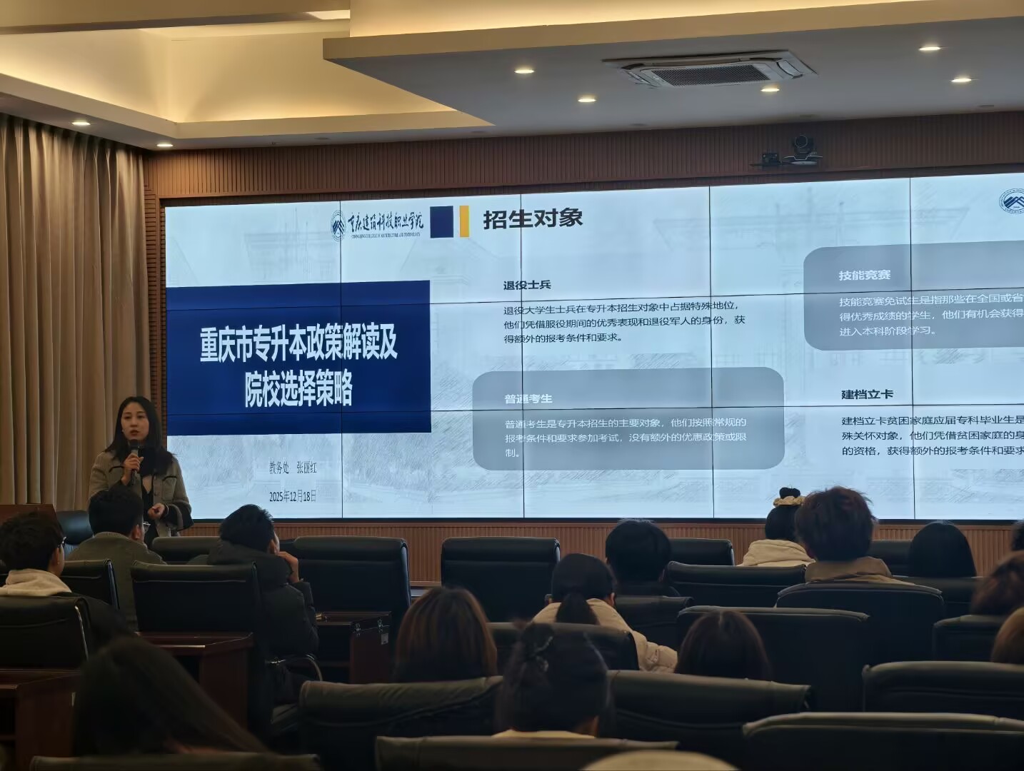 2025年12月18日下午18:00,由学校学工部组织2025-2026学年第一学期“升本课堂”之“制胜攻略”:精准把握政策,科学规划院校选择专题讲座在大数据中心举行。本次讲座由学校教务处张丽红老师主讲,值班书记、辅导员以及在校学生代表共90人共同参加。