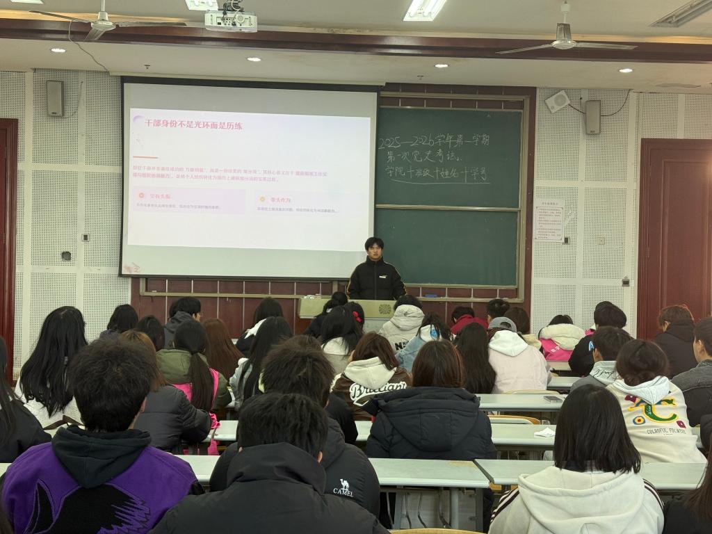 会议开始,主讲人何浩均强调学生干部身份的核心价值并非"万能钥匙"而是"能力加分项"。通过案例分析指出,干部需摒弃"空有头衔"的形式主义,在服务同学中锻炼组织协调、沟通应变等可迁移能力,实现"服务同学-能力提升-个人成长"的正向循环。