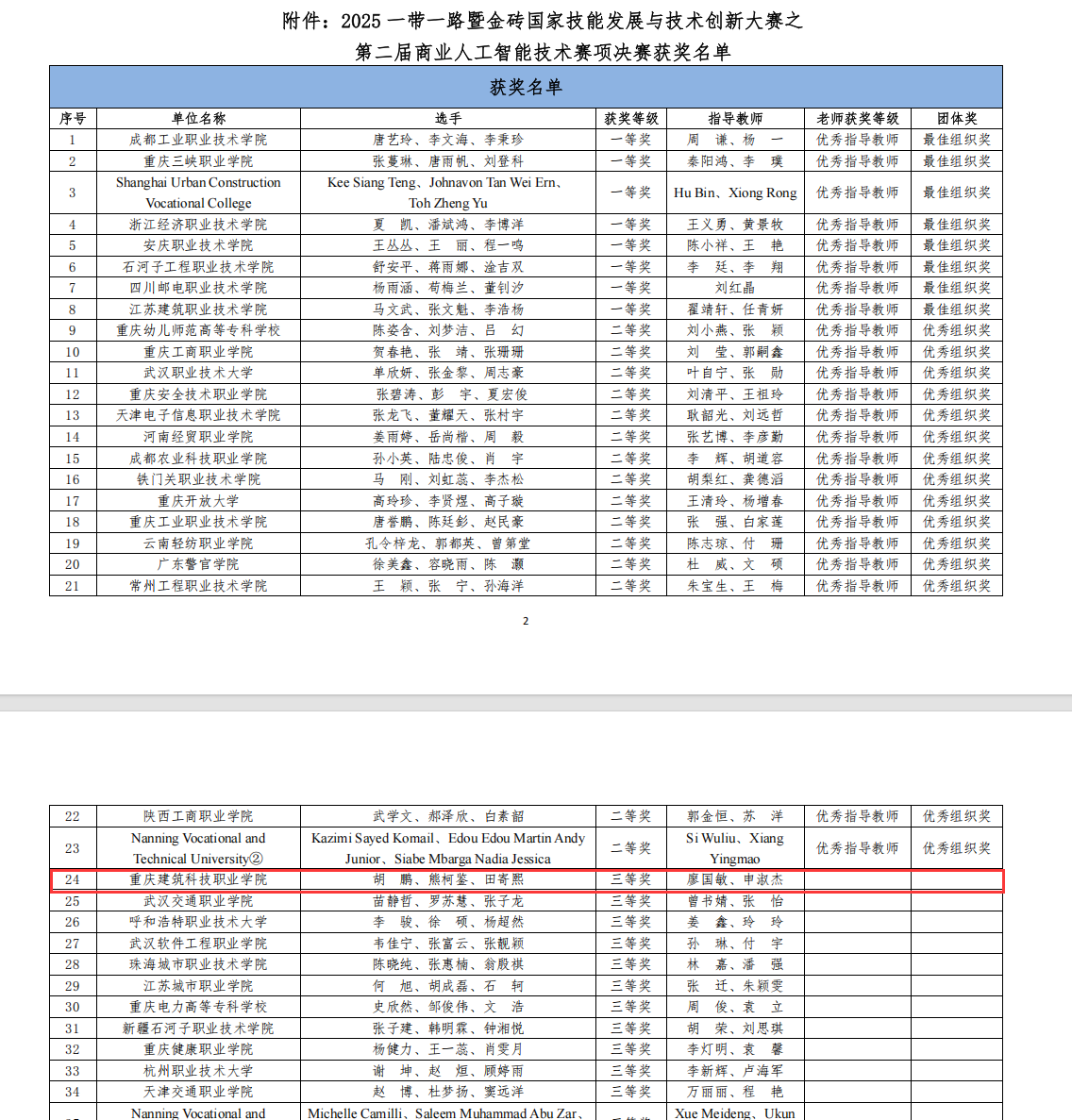 由金砖国家技能发展与技术创新大赛组委会主办的“2025一带一路暨金砖国家技能发展与技术创新大赛之第二届商业人工智能技术赛项决赛”,于2025年11月15日在成都顺利闭幕。我院2024级大数据技术专业学生胡鹏、熊柯鉴、田寄熙在廖国敏、申淑杰老师的指导下,凭借卓越的项目设计与技术实现能力,从众多参赛队伍中崭露头角,荣获全国三等奖。