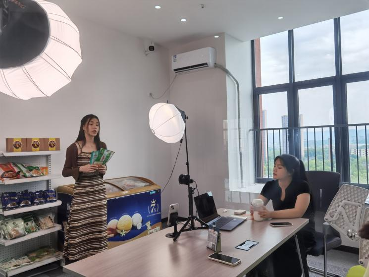 近日,为响应职业教育活动月的工作要求,并深化校企合作、促进产教融合,我院与深圳点淘网络技术有限公司(淘宝直播)联合举办的“新媒体与电商直播”校企联合教学项目,在职业教育领域再结硕果。该项目以淘宝直播为平台,涉及移动电子商务(专本贯)一班和二班共计89名学生,于2024年5月19日在我校科技楼8楼“点淘直播实训基地”成功举办了“直播带货展示”活动。