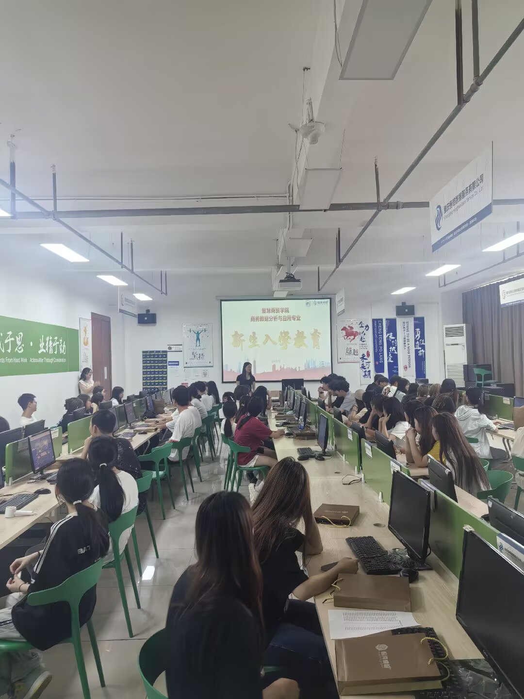 接着,来自重庆翰海睿智大数据科技有限公司的教务部部长方小婷老师详细为同学们进行了校企合作以及职业规划与发展方面的讲解。同时,从职业角度向同学们阐述了市场对人才的素质与能力要求,强调了专业技能、创新思维与团队协作的重要性,为新生们提供了连接学业与产业的宝贵视角。商务数据分析与应用专业长期与重庆翰海睿智大数据科技有限公司进行校企合作,通过企业老师授课、竞赛指导、职业素养培育、就业指导等多种方式促进专业学生培养。通过老师的讲解,同学们初步对于专业设置与校企合作模式有了一定的认知,同时对未来从事的社会岗位与能力要求也有了初步的了解。