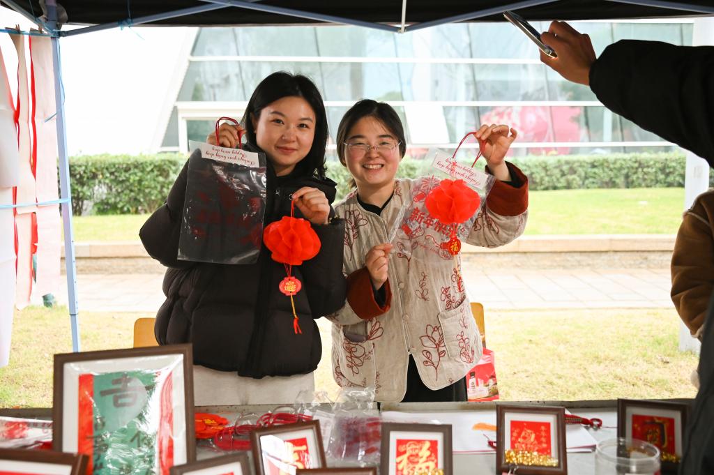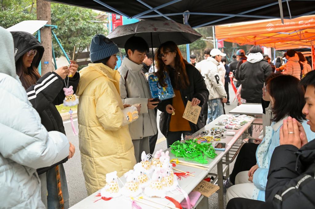 思政铸魂,让传统年味成为文化自信的“培育场”。非遗民俗区内,春联书写、中国结编织等传统项目轮番上演,非遗传承人与学生手工艺者现场教学,师生们在动手体验中感受中华优秀传统文化的魅力,增强文化认同感与自豪感。通过手把手教同学们写春联、做手工,不仅是传承技艺,更是希望把这份文化基因植入青春心底。互动游戏区的猜灯谜环节,更是融入了党史知识、校规校纪、传统文化常识等内容,让大家在轻松欢乐的氛围中接受思想熏陶,实现“娱乐中育人、体验中成长”。