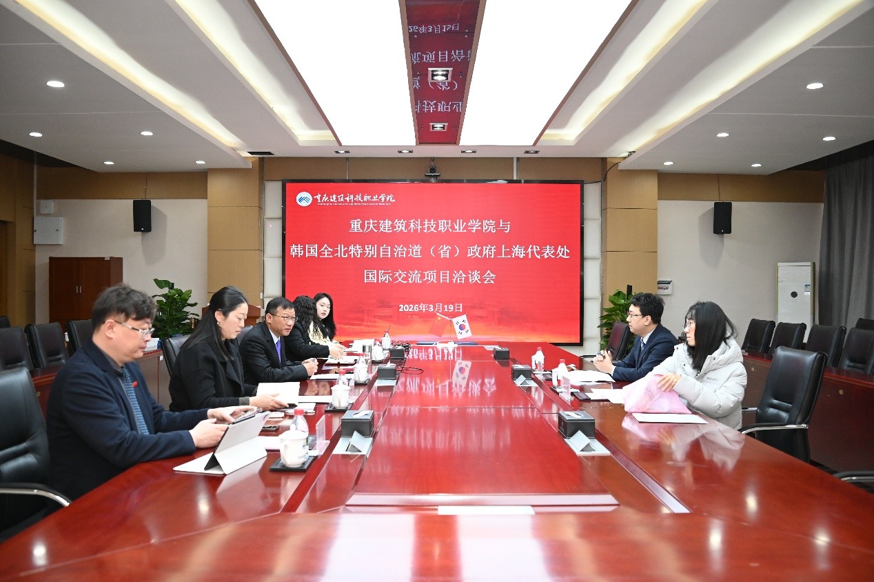 2026年3月19日上午,重庆建筑科技职业学院与韩国全北特别自治道(省)政府上海代表处国际交流合作签约仪式在学校立德楼六楼会议室顺利举行。韩国全北特别自治道政府上海代表处首席代表宋晟勋、室长徐雅善、部长吴洋,重庆建筑科技职业学院校长张进、副校长王靖,以及学校国际交流合作处、韩国事务部相关负责人出席仪式。仪式由王靖副校长主持。