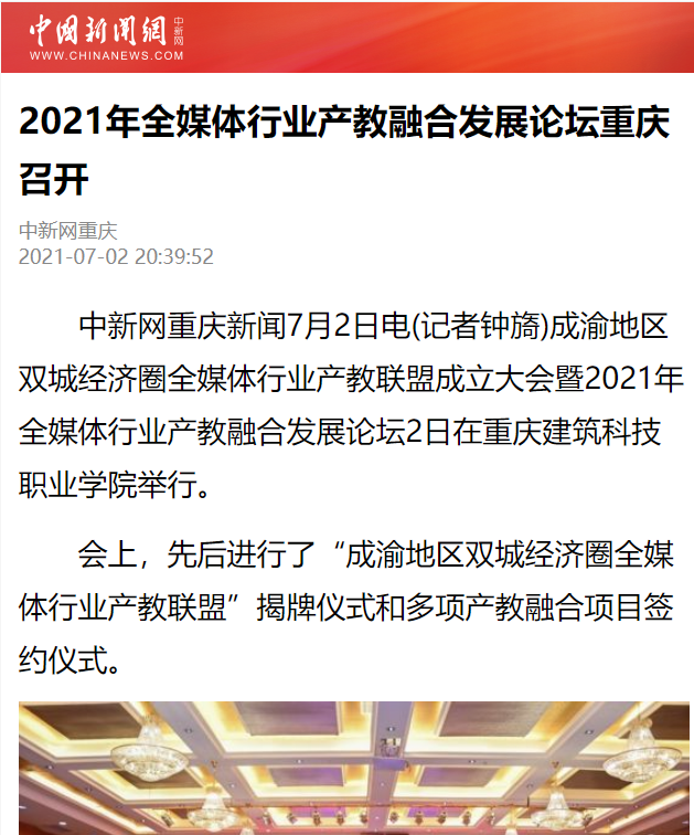 新华财经网、华龙网、中国新闻网等媒体报道我校举办成渝双城经济圈全媒体行业产教联盟成立大会暨2021年全媒体行业产教融合发展论坛