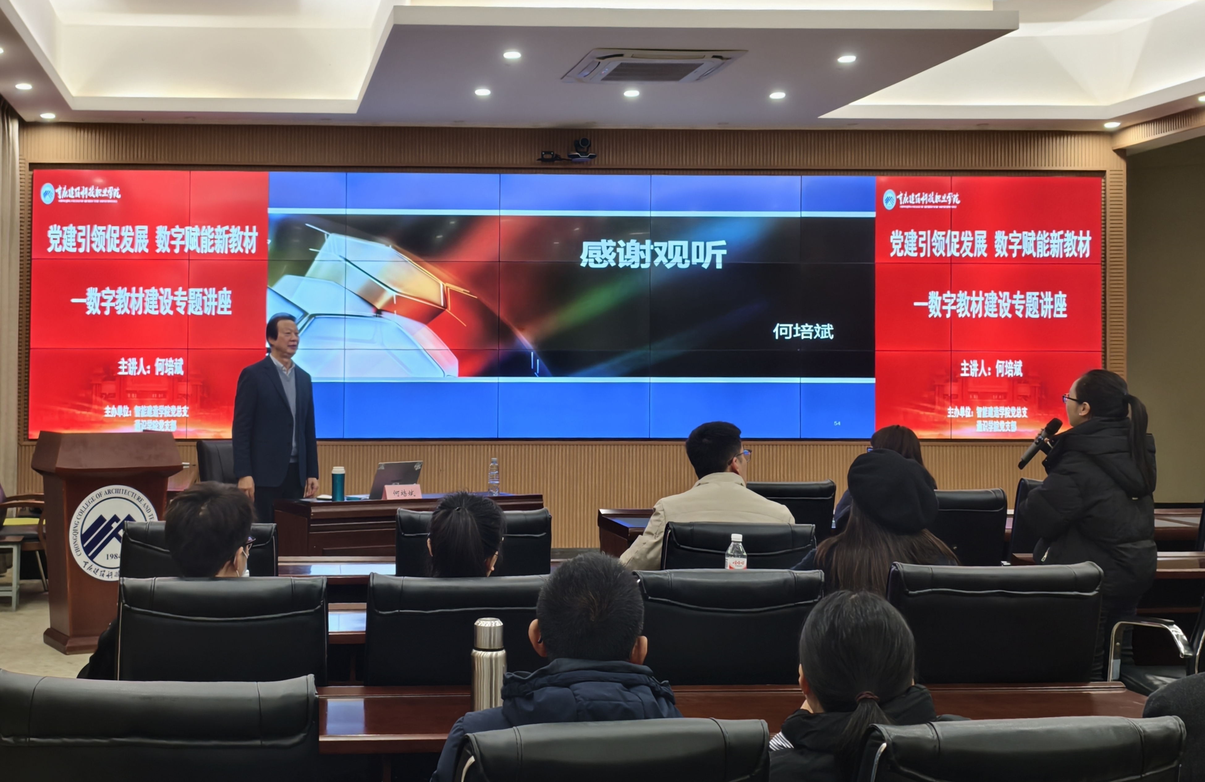 2025年12月12日14:00—16:00,大数据中心内座无虚席,由智能建造学院党总支和通识教育学院党支部共同主办的数字教材建设专题讲座成功举办。重庆建筑科技职业学院副校长何培斌教授受邀作了专题讲座,为全体参会教师带来一场兼具理论高度与实操价值的学术盛宴。