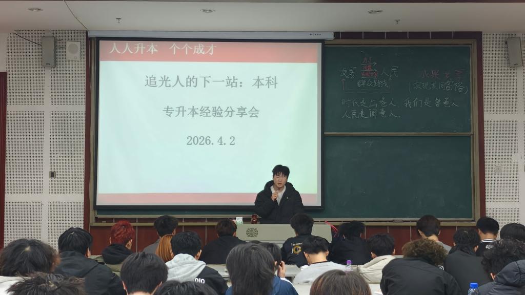 为深入落实学院“人人升本,个个成才”育人理念,近日,马克思主义学院思政课教师结合课堂教学实际,组织了一场以学生为主体的专升本经验分享会。活动围绕“为什么报考专升本”“专升本对自身成长的好处”以及“备考复习中的实用经验”三大主题展开,同学们踊跃分享、积极互动,课堂气氛热烈。