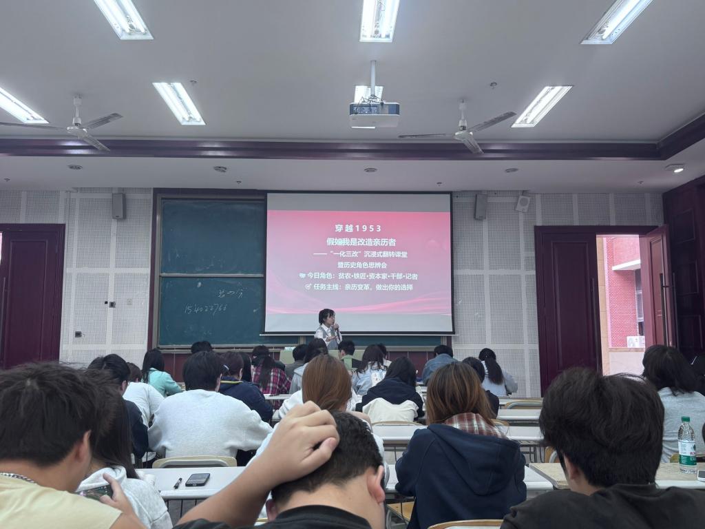 近日,我校马克思主义学院成晓静老师在《毛泽东思想和中国特色社会主义理论体系概论》课堂上,面向25级班级学生创新开展“穿越1953·时光证人”思政翻转剧场活动。学生分组扮演贫农、手工业者、民族资本家、政府干部和穿越记者五类角色,通过“互助组入社动员”“公私合营谈判”等历史情景再现,沉浸式体验社会主义改造时期不同群体的真实心态与历史抉择,让抽象的理论知识转化为可感可知的鲜活体验。