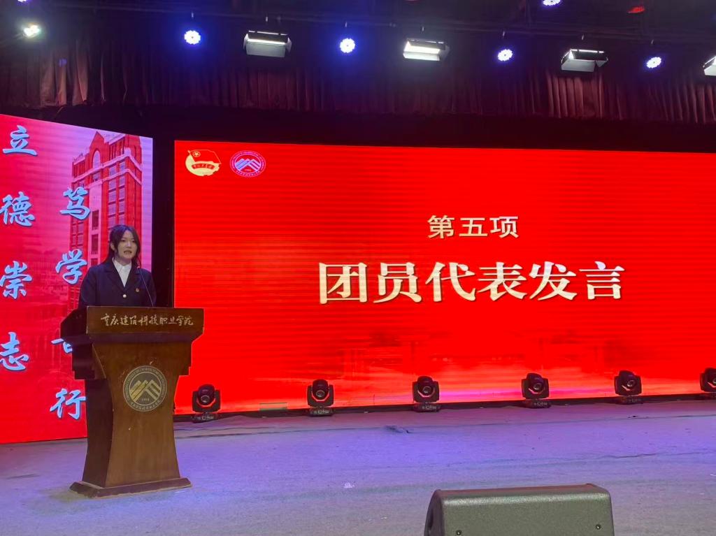 新发展团员代表董如意发言时表示,将以团员标准严格自律,牢记习近平总书记对青年的殷切嘱托,立足建筑科技专业特色,把个人理想融入国家城乡建设与行业发展大局,勤学专业知识、苦练实操技能,在实践中锤炼政治品格,为强国建设、民族复兴贡献青春力量。