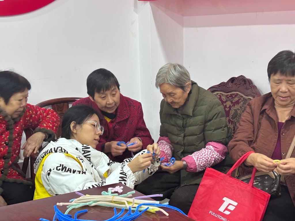 志愿者们通过扭扭棒创作、趣味投壶、老歌合唱与暖茶闲话等活动,与社区老人进行互动。志愿者们以“轻创作、重陪伴”为原则,为老人提供了花卉、小动物等简易扭扭棒创作模板,并将投壶设备调整为无锋利边缘、材质轻便的样式,确保所有老人都能轻松参与。