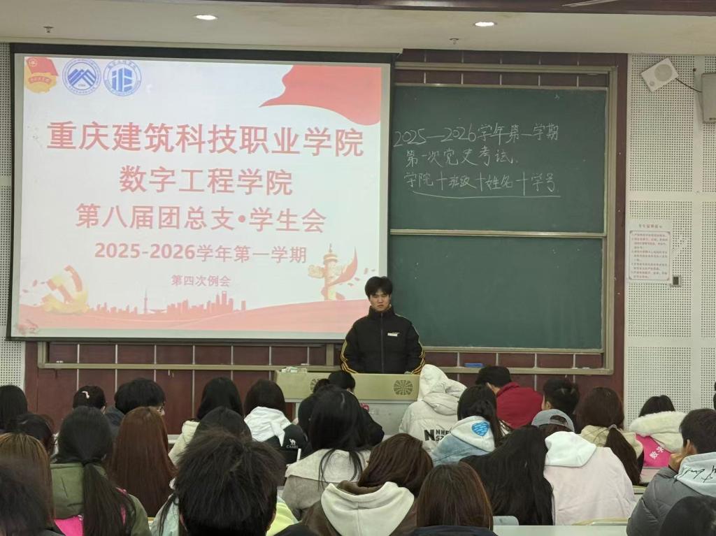 为进一步强化学生干部责任意识,提升工作效能,凝聚团队合力,重庆建筑科技职业学院数字工程学院第八届团总支·学生会于2025-2026学年第一学期召开第四次例会。全体学生会成员参会,会议围绕干部价值认知、学业工作平衡、团队建设等核心议题展开,为后续工作开展明确方向。