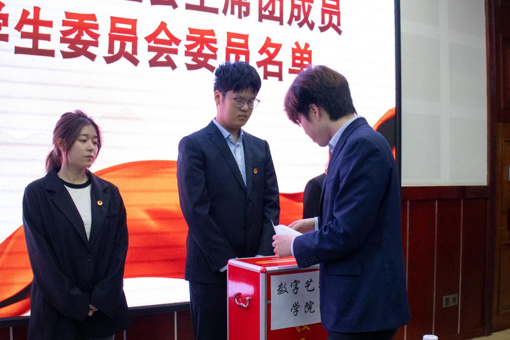 随后,大会进入选举程序。与会代表以高度的责任感和使命感,本着公平、公正、公开的原则,通过无记名投票方式,差额选举产生了数字艺术学院新一届学生委员会。胡静阳、周然等4名同学当选为新一届学生委员会委员。在圆满完成各项预定议程后,数字艺术学院第二次学生代表大会在激昂的《中国共产主义青年团团歌》声中胜利闭幕。
